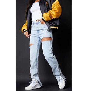 NEW PrettyLittleThing Light Blue Wash Thigh Rip Distressed Split Hem Jeans P614