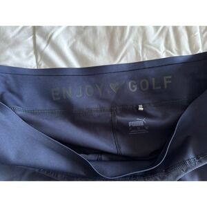 Crafted for comfort and performance, the Puma Power Shape Golf Skort is a stylish and functional addition to any golfer's wardrobe. The navy blue skirt, accented with the Puma logo, is a size XL and designed for a regular fit. Its shaping features and blend of polyester and spandex materials ensure a flattering look and ease of movement on the green.