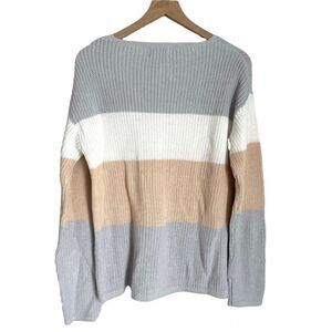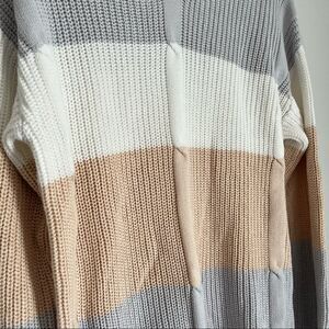 Pure Knits by Neon Buddha women’s v neck colorblock sweater in tan, white and gray. Size small.