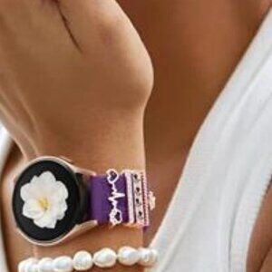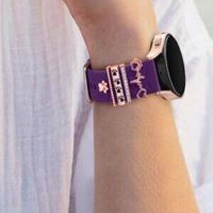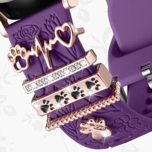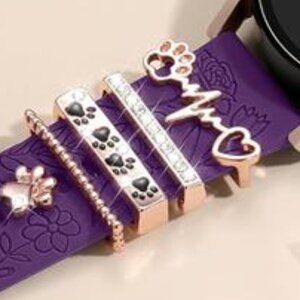 Engraved band with charms for samsung galaxy watch band. Comes with sparkling metal dog paw themed decorative rings.
