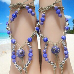 These handmade barefoot sandals are truly one of a kind! They are made from soft, natural hemp knotted with purple glass beads and silver-colored metal beads. The toe strap and ankle ties are braided for extra durability. These sandals have long 17-inch long ties with beads at the ends. The ties wrap around the ankle and can be adjusted to fit all adult sizes.