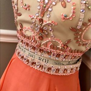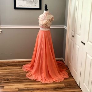 Gorgeous! 💫💫💫 Coral Two Piece Formal Evening Gown. Beaded Illusion Capped Sleeve Crop Top, Padded Bra, High Collar, Hook Back. Long Flowing Chiffon Skirt With Beaded Waistband, Slight Train, Zip & Hook. Note: May Be Loose/Missing Beads. Comes With Extras. It’s Exquisite! ✨🌹✨
