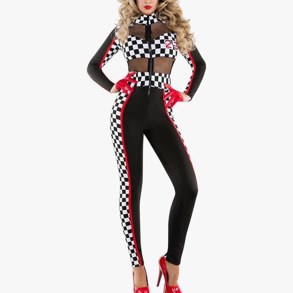 Rev up everyone's engine in this hot Racy Racer women's costume from Starline. This premium quality costume features a black collared catsuit with red zipper detail. black and white checkered design and mesh cutout.