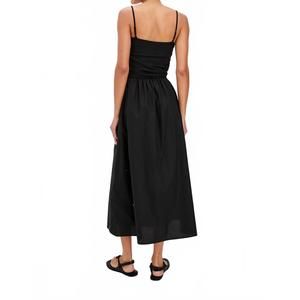 Discover the Fisher Dress by Rails, an easy-to-wear summer essential in solid black with a fit and flare silhouette. This midi dress features spaghetti straps and a scoopneck, crafted with a fitted jersey cotton top composed of 95% Modal and 5% Spandex, along with a cotton poplin skirt made of 50% Cotton and 50% Tencel. It is imported and includes thoughtful details like a ruched bodice, hip pockets, and a tie closure. For care, hand wash cold and line dry in the shade; avoid bleach, and use a cool iron if needed. Front body length: 43 1/2" (measured from size S).