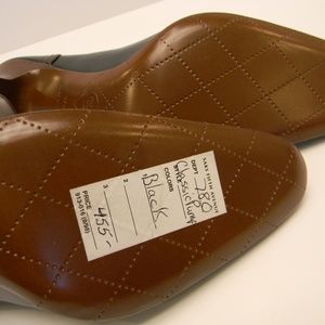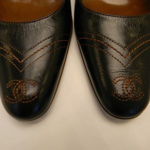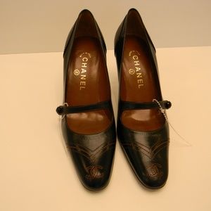 NEW with BOX - black leather strapped pump w/burnt orange stitching details, leather interior, CC logo stitched into toe w/tiny brass CC logo centering strap buttons. GORGEOUS, never worn, w/2 black Chanel shoe bags! True to size fit.