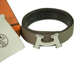 This Hermès "H" Smile Limited Edition is a reversible leather belt with Black and Taupe colors.
