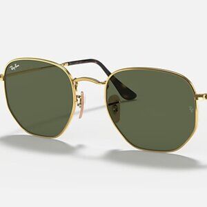 New with tags. The Ray-Ban RB3548N Hexagonal sunglasses put a modern spin on vintage style with their unique geometric shape and iconic G-15 green lenses. Featuring a polished Arista gold metal frame and slim temples, these sunglasses combine lightweight comfort with statement-making flair. The solid G-15 lenses offer natural vision with enhanced contrast and 100% UV protection, while adjustable nose pads ensure a custom fit for everyday wear.