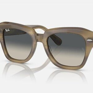 Brand new and 100% authentic Ray-Ban State Street sunglasses, a bold, squared-off evolution of the iconic Wayfarer. This version features a unique Polished Striped Green acetate frame and sleek Grey lenses for a fashion-forward look with classic appeal.