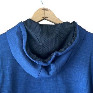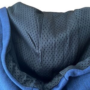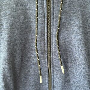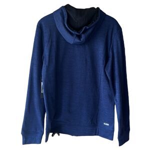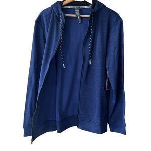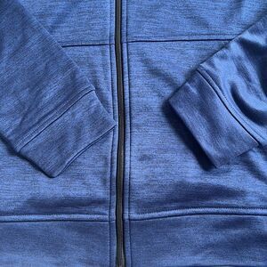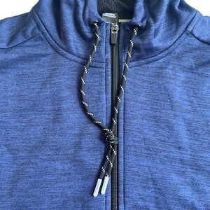 Navy blue striated. Full zip up to a drawstring hood. Pockets on the front. Says X-Dri on the back. Fleece back keeps you warm and cozy. Flexibility for comfort and performance. Quick drying allows moisture to evaporate fast.