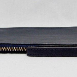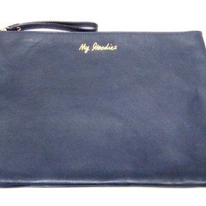 New Rebecca Minkoff Smooth Leather Wristlet Pouch. Deep Plum/Ultraviolet Purple. Blue interior with black polka dots and logo. Large-size, clutch style. 'My Goodies' writing on front. Logo on back. Zipper closure with wrist strap. *Please note: Model photo included for proportions; Last picture just for proportion not actual color. Imported.