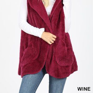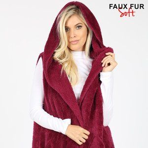 NEW RED WINE FAUX FUR HOODED TEDDY VEST W/ POCKETS