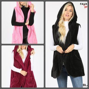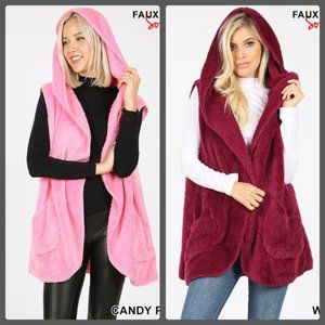 SUPER SOFT AND COZY HOODED FAUX FUR COCOON VEST WITH SIDE POCKETS