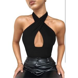 NEW REORIA Criss Cross Halter Neck Bodysuit Top Clubwear L