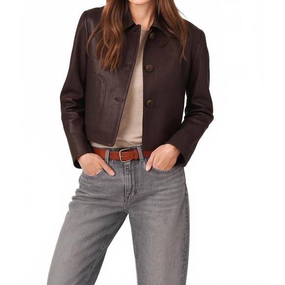Introducing the Morro Leather Jacket by REPEAT cashmere, a distinguished piece perfect for vintage fall fashion. Crafted from 100% leather, this jacket features a solid pattern in a rich Morro hue. Designed with long sleeves, it includes a classic collar and convenient pockets for everyday essentials. Closure: Button closure. Ideal for vacation occasions, this versatile piece embodies timeless elegance.