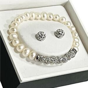 Sterling Silver Fresh Water Pearl BRACELET + EARRINGS Crystal Pave - New In Box