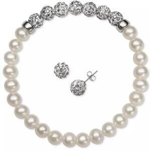 A beautiful cultured freshwater pearl stretch bracelet is enhanced with crystal beads in this two piece set, which also includes crystal pavé stud earrings.