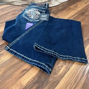 Description: Midrise bootcut jeans with a dark vintage wash, Aztec longhorn embroidered patch pockets, and slimming stretch denim.