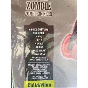 Halloween Boys Rock Zombie Costume 6 piece Set Wig Belt Shirt Glove Leg And Head Wrap. Ripped shirt with flames designs, red and black wig, fake leather headband, glove and a leg wrap. Great for Halloween, themed parties, plays or special events