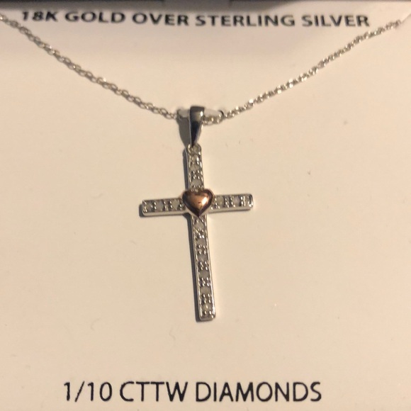 = NEW = ROSE GOLD HEART ON CROSS SILVER NECKLACE