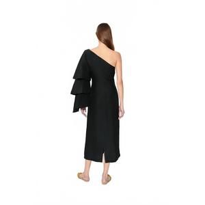 Introducing the Bidi Bidi Bom Bom Tea Length Dress by Rosie Assoulin, an elegant event dress perfect for your collection. This sleeveless dress is made from a luxurious linen blend with a lining of 100% cotton, offering a comfortable yet stylish sheath silhouette. Designed without pockets, it features a sophisticated off-the-shoulder neckline in a minimalist solid black pattern. Care instructions recommend dry cleaning to maintain its exquisite appearance.
