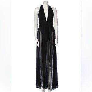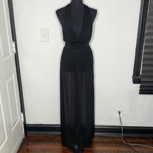 This black maxi dress is perfect for any beach or pool party. It’s has a built in underwear- full coverage. Sheer from the waist down. Halter top with Low v-neck & adjustable straps that goes around the neck.