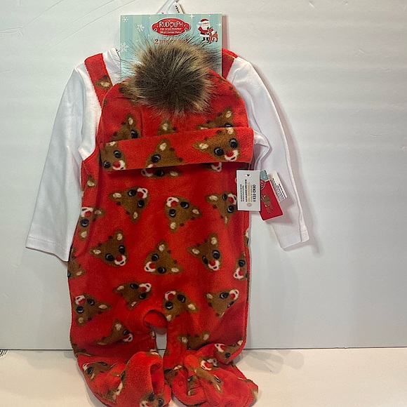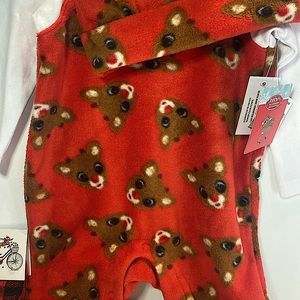 NEW OFFICIAL LICENSED 2 PIECE RUDOLPH SLEEP & PLAY & HAT SET RED WHITE BROWN SUPER SOFT SIZE 6 MONTHS ATTACHED WHITE LONG SLEEVE TEE BUTTONS ON LEGS & TEE SHIRT
