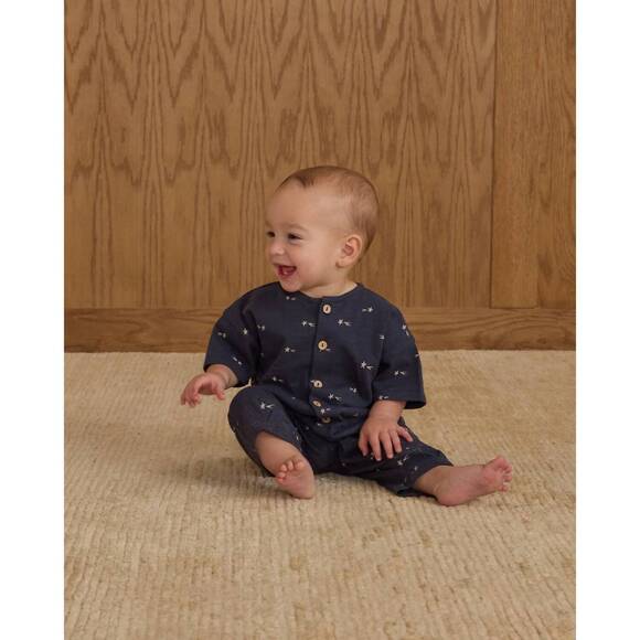 - Description: The Baby's Hayes Jumpsuit by Rylee + Cru is the perfect pick for summer festivities, like a 4th of July celebration or any holiday party. Featuring a seamless one-piece design, this jumpsuit is crafted from 100% cotton in a charming navy hue with star patterns, adding a playful graphic touch. Designed for boys, it embodies streetwear trends with a comfortable and stylish fit. Care instructions include machine wash and tumble dry for ease of maintenance.