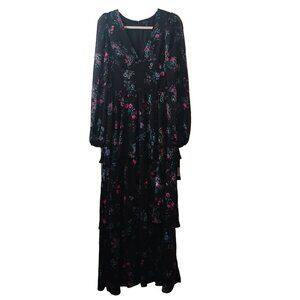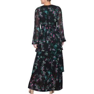 Keywords: Rachel Roy, metallic dress, chiffon maxi, holiday bouquet, sheer sleeves, lined dress, tiered design, hidden zipper, party dress, evening wear, black gown, special occasion, designer dress, holiday party dress, Christmas party dress