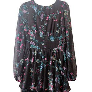 Elegant and stylish Rachel Rachel Roy maxi dress in metallic chiffon with a holiday bouquet pattern. Features tiered design, puff semi-sheer sleeves, and a hidden back zipper. Perfect for special occasions.