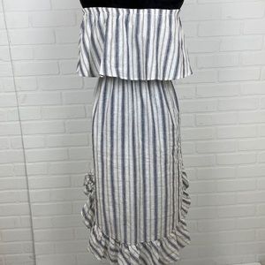 Rachel Rachel Roy Jacinta Stripe Popover Linen Blend Dress, NWT, Creamy white with navy stripes , Size small. Slip into the Jacinta dress featuring an all over stripe print and feminine popover. Bandeau, Strapless, Sleeveless , 2 side seam pockets, Popover, Stripe print, Ruffle hem, Elastic waist, Linen blend construction, Unlined, 55% linen, 45% cotton, machine wash cold. Approx measurements laying flat; Waist unstretched 12.5”, Length 38.5”