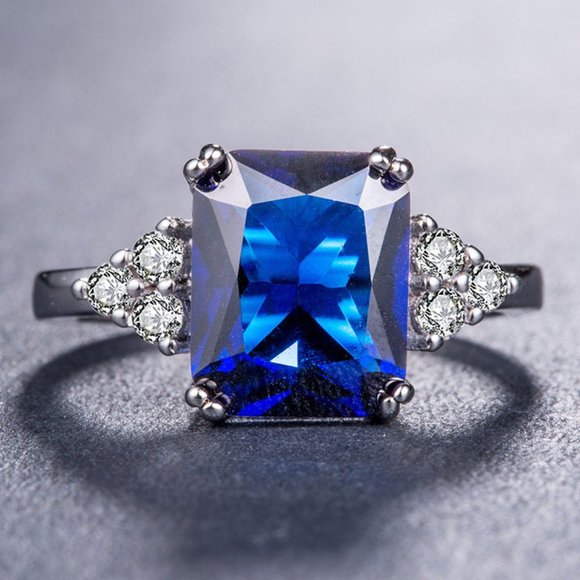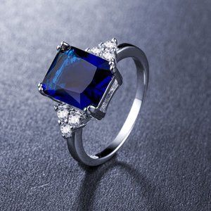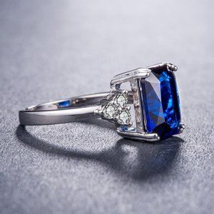 NEW Radiant Cut Blue Sapphire Silver Diamond Ring