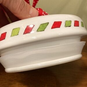 BOW ON THE LID. THE LID HAS RED AND GREEN BLOCKS/THICK STRIPES.
