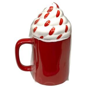 NEW Rae Dunn Ceramic Peppermint Mocha COFFEE MUG + TOPPER Cover Lid Red & White
