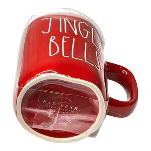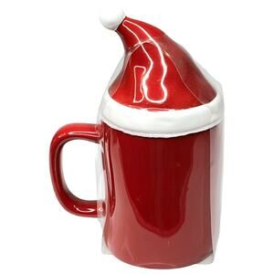 NEW Rae Dunn Jingle Bells Ceramic COFFEE MUG + TOPPER Cover Lid Santa Hat Red