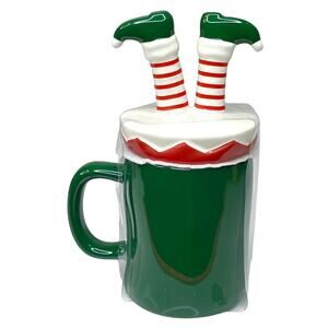 NEW Rae Dunn Santa's Helper Ceramic COFFEE MUG + TOPPER Cover Lid Elf Legs Green