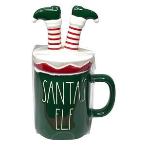 Rae Dunn Santa's Helper Ceramic COFFEE MUG + TOPPER Cover Lid Elf Legs - NEW In Package!