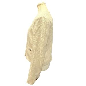 Crafted from a textured woven fabric for a refined, structured look. Features a round neckline, front button closure with bold contrast buttons, and flap pockets with button detail. Cropped length adds a modern edge to this timeless silhouette. Fully lined for comfort and quality.