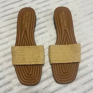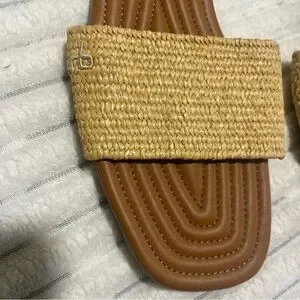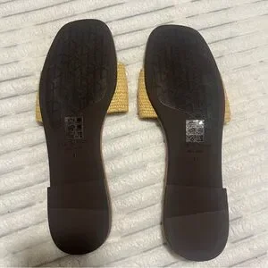 Rag & Bone raffia slide sandals. Called the Ellie Slide Sandals in the Nat color. Rounded square toe, raffia style large strap, rb logo embroidered on the outer edge of the strap. Size EU 41, equivalent to US size 11. New condition, unused.