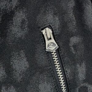 The leopard print on these slim pants tames its roar with grey-scaled tones and the zippered front pockets add an edgy touch.
