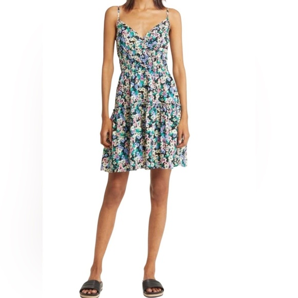An allover floral print brings a warm-weather vibe to this fluttery mini sundress fitted with a smocked waist and tiered skirt for eye-catching definition