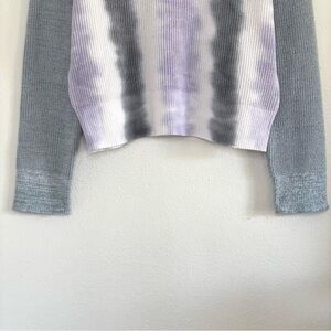Cotton cashmere blend, long sleeve crew neck sweater featuring white, light purple and grey tie dye print, patchwork sleeves, relaxed shoulder, and ribbed at hem, neckline and cuffs. This chunky rib knit sweater with its unique tie dye design will keep you warm and looking cool at the same time.