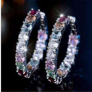 💗 NEW Pair Of Elegant And Delicate Rainbow Colored Beautiful Crystals Full Circle Hoop Earrings For Women. Stylish And Versatile, any occasion Earrings. A bit bigger than a quarter with stunning sparkle 💗