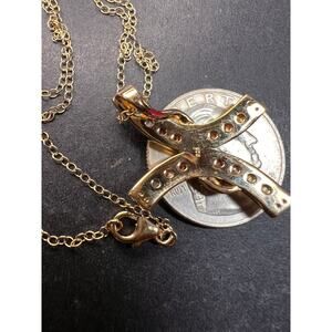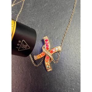 Genuine multi colored sapphire gemstones in an array of rainbow colors. Mined and likely heat treated for color enhancement. Prong set in an authentic 925 sterling silver setting plated with a gold vermeil finish. 1.60 total ctw. Chain measures 20 inches and is also yellow gold vermeil over sterling silver with a lobster claw clasp. Total weight is 4.50 grams. White / colorless accent stones are natural zircon. Made in Thailand. Estimated retail value is $500.