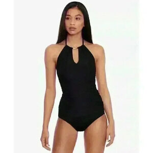 Go for a classic, streamlined look poolside in this Lauren Ralph Lauren tankini top with a hardware-accented halter neck.