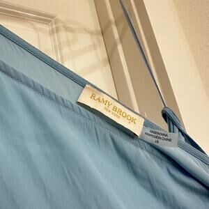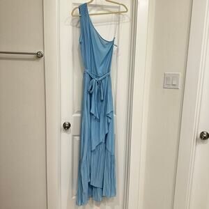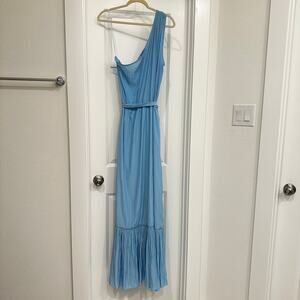 Ramy Brook Nicola One Shoulder Belted Ruffle Dress in Misty Blue Size: Large New without tag Color: Misty Blue 100% Polyester Dry Clean Only Maxi length One shoulder Belted waist Relaxed fit Sleeveless Pull on styling