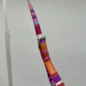 This rare Vera Bradley Caroline Shoulder Bag Clutch Wallet from the Vintage Y2K Silk Collection features a vibrant hibiscus stripe pattern in pink and orange. The silk bag has a ruffle detail, snap closure, and an adjustable removable strap.