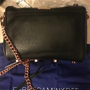 Brand New Mini Mac Crossbody black leather with rose gold hardware. Tags attached, plastic wrapping is still on the handbag, dust bag is included and card of authenticity is inside the bag. It is a sexy bag, that can be carried for a casual or dressy event.