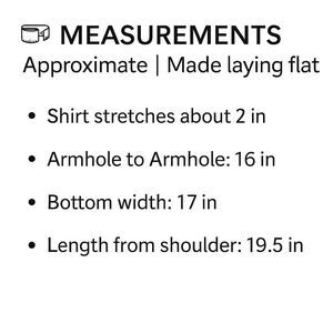 Approximate | Taken flat | Shirt has ~2″ stretch