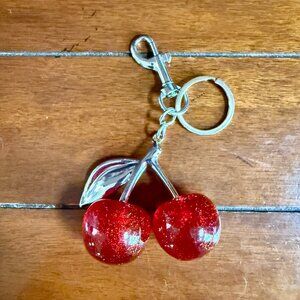 NEW Red Glitter Large Cherries Purse Charm Keychain Silver Toned