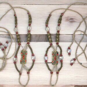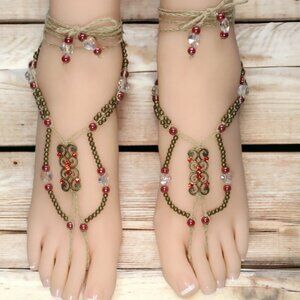 These handmade barefoot sandals are made from soft, natural hemp knotted with red glass, crystal clear glass, crystal hearts, and bronze-colored metal beads. The centerpiece is a large ornament studded with red rhinestones.. The toe strap and ankle ties are braided for extra durability. These sandals have extra-long 24-inch long ties with beads at the ends. The ties wrap around the ankle and can be adjusted to fit all adult sizes.